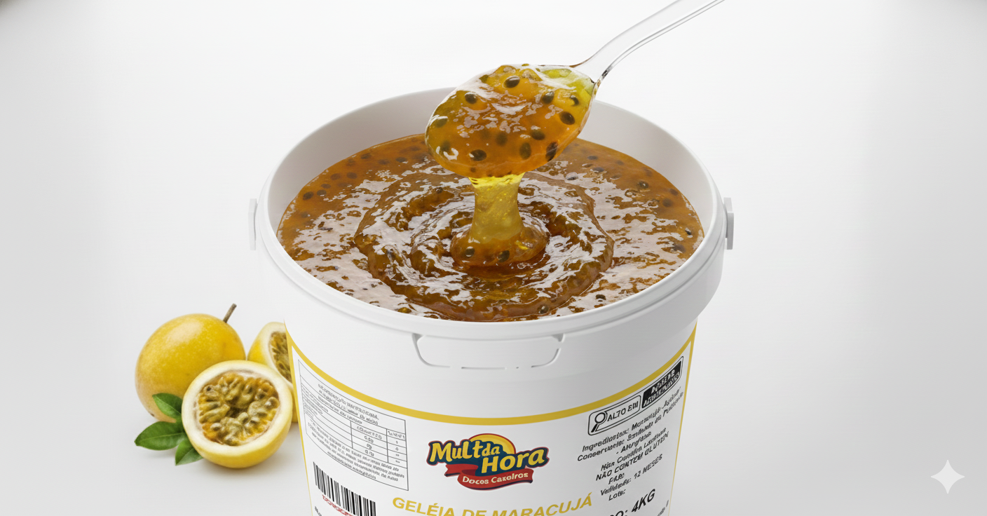 Geleia de Maracujá Gourmet Mult da Hora (Balde 4kg) foi projetada para atender aos mais rigorosos padrões da gastronomia profissional. Unindo a acidez equilibrada da fruta selecionada ao apelo visual das sementes, ela é a solução ideal para empresas que não abrem mão da qualidade "feita à mão", mas precisam de escala e padronização industrial em 2026.